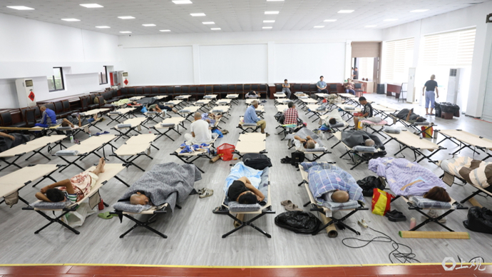 安置点里面整齐摆放60多张折叠床,空调恒温25℃。食物储备充足,医疗救护人员和志愿者队伍各司其职。