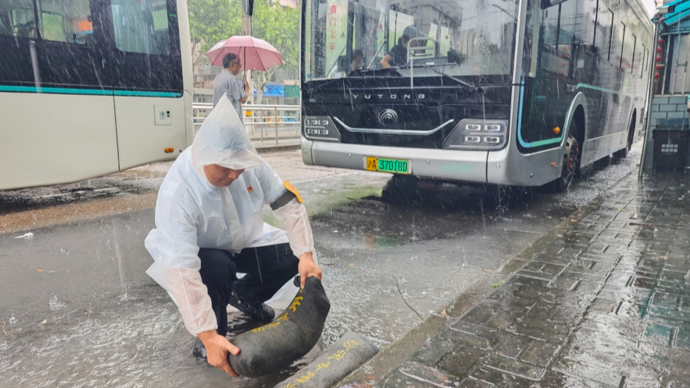 久事公交铺设防汛沙袋