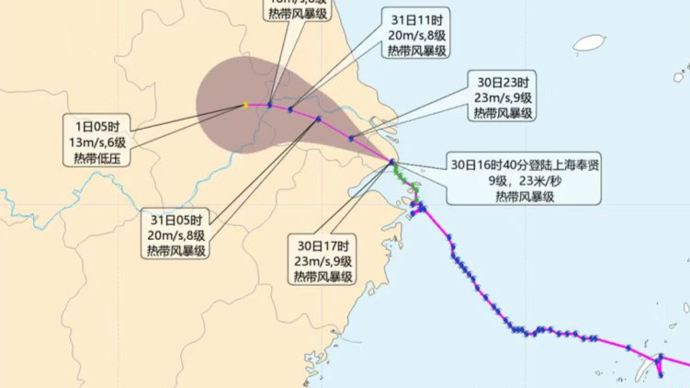 今年第8号台风“竹节草”的中心7月30日17时仍位于上海市奉贤区境内,就是北纬30.9度、东经121.7度,最大风力有9级(23米/秒),中心最低气压为978百帕。