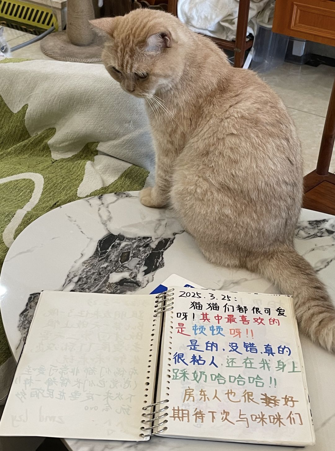 房间厚厚的留言本上,客人们画下了店里猫咪的可爱模样,并写下了各自的感触:“睡醒就有小猫贴贴,好幸福。”“很适合放松的一个地方。忽然被小猫趴上了......非常萌的一群小猫咪。”