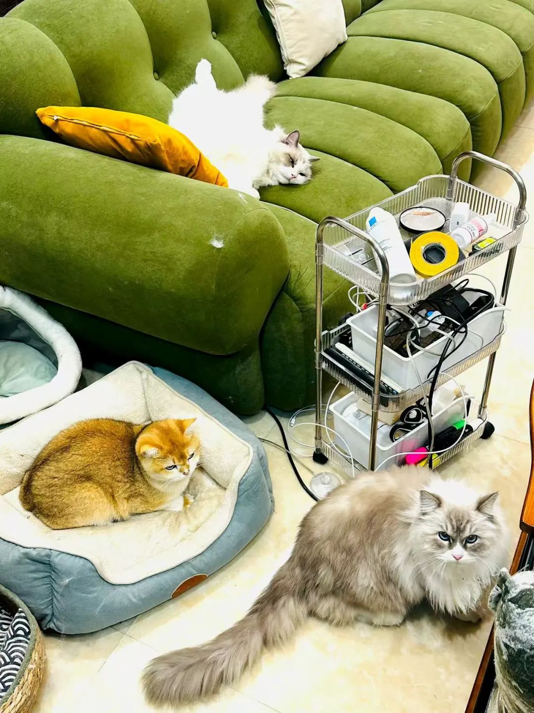 推开“广州猫咪侍寝酒店”的门,第一个动作是换鞋。每位客人都需在入门的换鞋区换上干净的拖鞋,接着,轻轻推开一道防止宠物溜走的白色铁栅栏,便进入一个开阔明亮的客厅。客厅里整齐摆放着猫碗、猫窝和猫爬架等,几只猫咪或悠闲地走动,或怡然地打盹,还有几只正活泼地追逐、嬉戏。