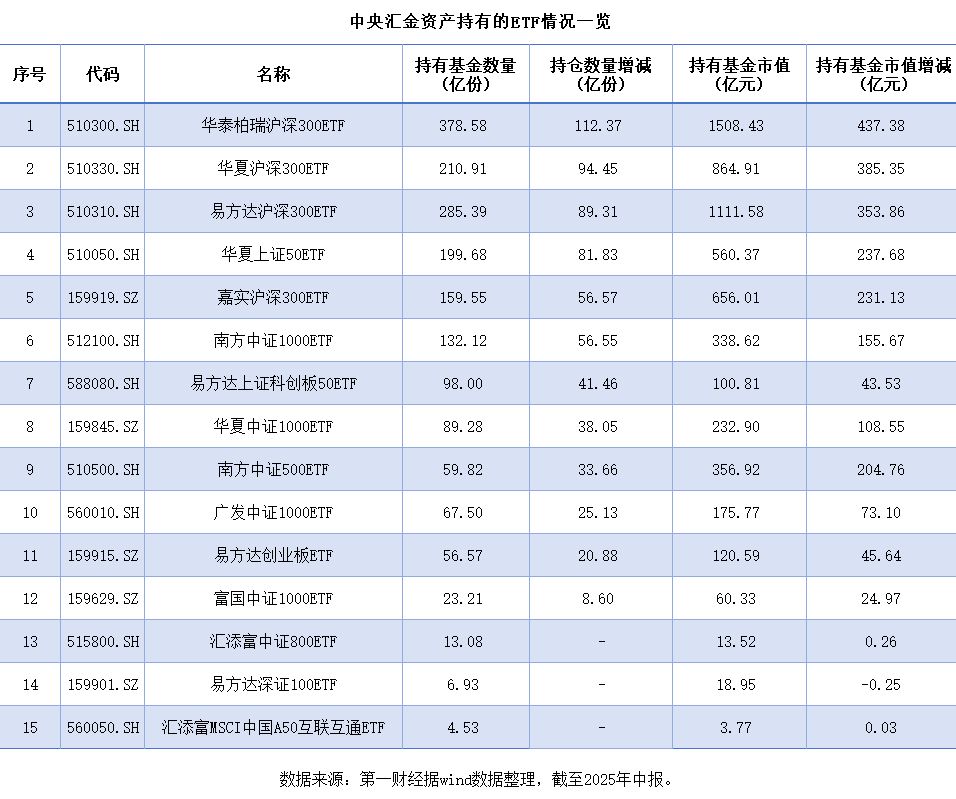今年上半年A股市场大幅波动中,“国家队”资金再次彰显定力和影响力。随着公募基金中报的披露,中央汇金投资有限责任公司(下称“中央汇金”)、中国国新控股有限责任公司(下称“中国国新”)等重要机构的调仓路径清晰浮现。截至6月底,受益于份额增加与净值提升,三家“国家队”合计持有26只ETF,总市值达1.28万亿元,年内增幅超两成。