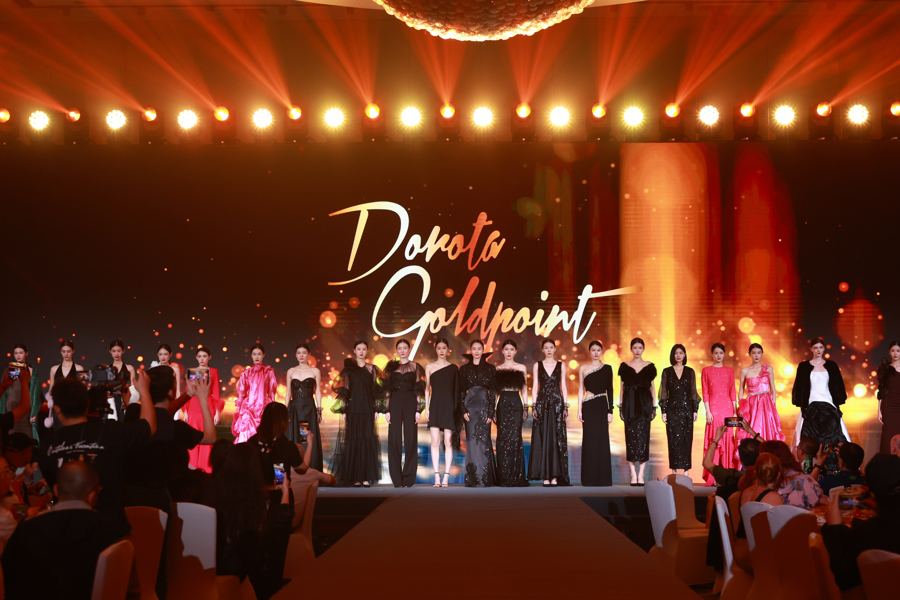 晚宴现场,两场风格迥异却同样精彩的大秀惊艳全场:波兰著名设计师Dorota Goldpoint(波兰总统经济顾问、国际奢侈品牌“Dorota Goldpoint”创始人)带来中国首秀,50套以毛皮等天然面料为主的晚礼服,将国际时尚美学演绎得淋漓尽致;“惠影箱韵”秀则以现代设计语言重构福建惠安女传统服饰,绚丽色彩与独特造型令人眼前一亮,搭配的惠安箱包新品兼具颜值与质感,完美诠释东方美学与现代时尚的融合。两场大秀跨越国界、联结传统与现代,为观众呈现一场“无界”的时尚盛宴。