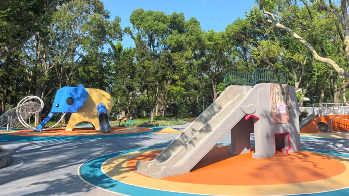 全新无动力儿童乐园以大象元素为主题。改造中,不仅保留原有的水磨石大象滑梯设施,还将园内一座石雕大象迁移至该区域。此外,增设卡通猛犸象、小象摇马等不同类型的“大象”元素设施。