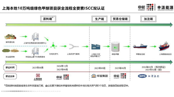 项目目前获得的十一张认证证书涵盖了申能集团位于金山区廊下镇生物质基地和城投集团位于老港生态环保基地的绿色甲醇原料端、华谊集团绿色甲醇生产端,申能集团和上港集团绿色甲醇贸易、仓储和加注端,标志着上海本地10万吨级绿色甲醇项目取得了进入全球市场并于上海港进行加注的“绿色通行证”。