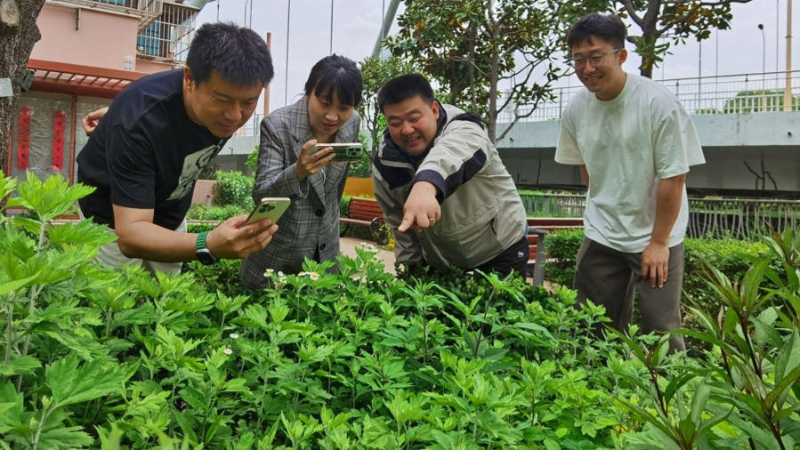 在新泾苑小区里的中泾生境花园,华东师范大学生物多样性调查团队的老师带领居民观察记录传粉昆虫。 陈玺撼摄