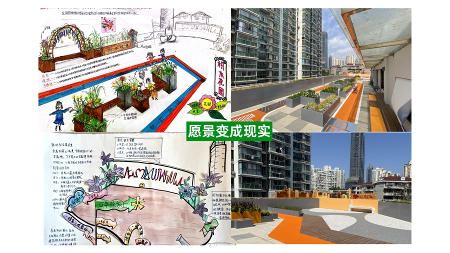徐汇区织生社区规划发展研究中心总干事孙美雯拿出两幅上海交通大学附属小学孩子的“设计图”,这些充满想象力的涂鸦竟然化为了现实的花坛、桌椅、步道、栅栏:“让我印象特别深的是一个孩子提出的积木概念,装置和设施不固定,可以重新布局,现在花园里的花坛就是可拆卸的。”