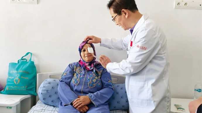 这是2025年7月,中国工程院院士、眼科专家范先群带领上海专家组,在舍夫沙万开展为期2周的“光明行”眼科义诊活动。法蒂玛老人受白内障困扰多年,视力仅剩光感,当得知中国医生要来开展眼科义诊,便在家人陪同下来到医院。