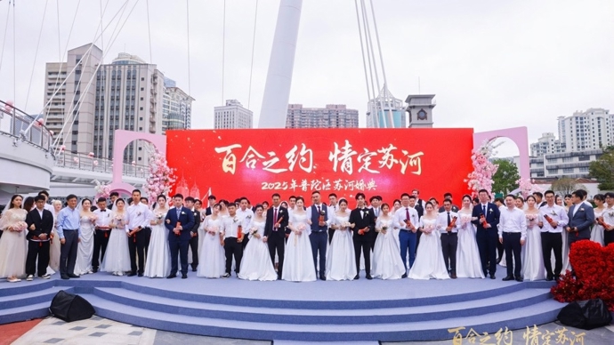 9月20日,在这个寓意“就爱你”的甜蜜日子里,“百合之约 情定苏河”——2025年普陀区苏河婚典在苏州河百合桥广场浪漫启幕。