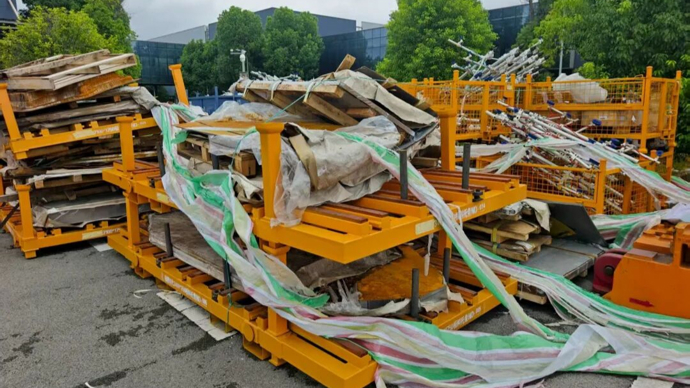 厂房后的绿化带旁,两处空地成为零部件的露天堆场。还没有来得及被使用就被随意堆放的零部件被堆成一个个垛头,像是一个零部件的坟场。