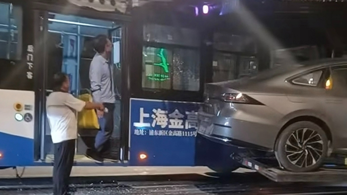 原标题:《浦东巨峰路轿运车转弯擦撞公交》