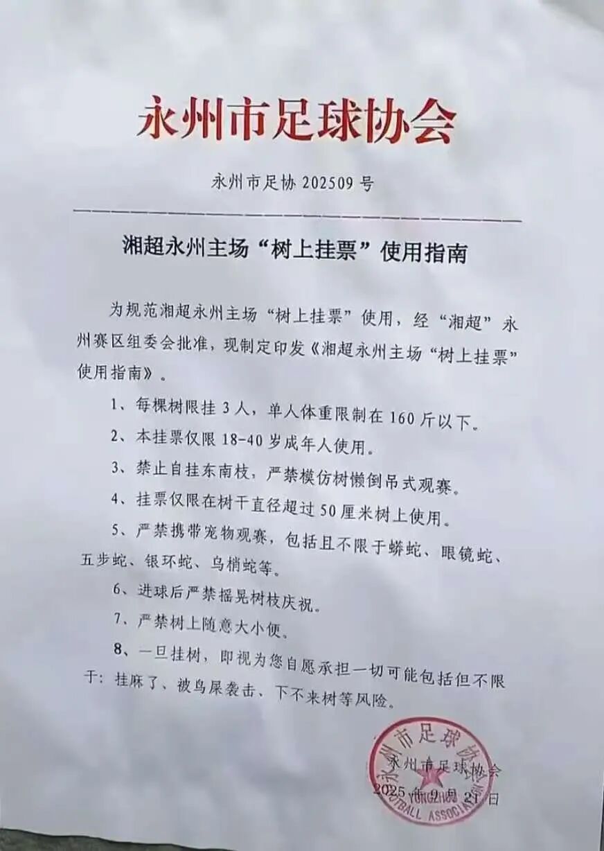 今天(9月21日),2025年湘超联赛将迎来永州队主场对阵湘潭队的赛事。赛前,永州足协发布《湘超永州主场“树上挂票”使用指南》引发关注。