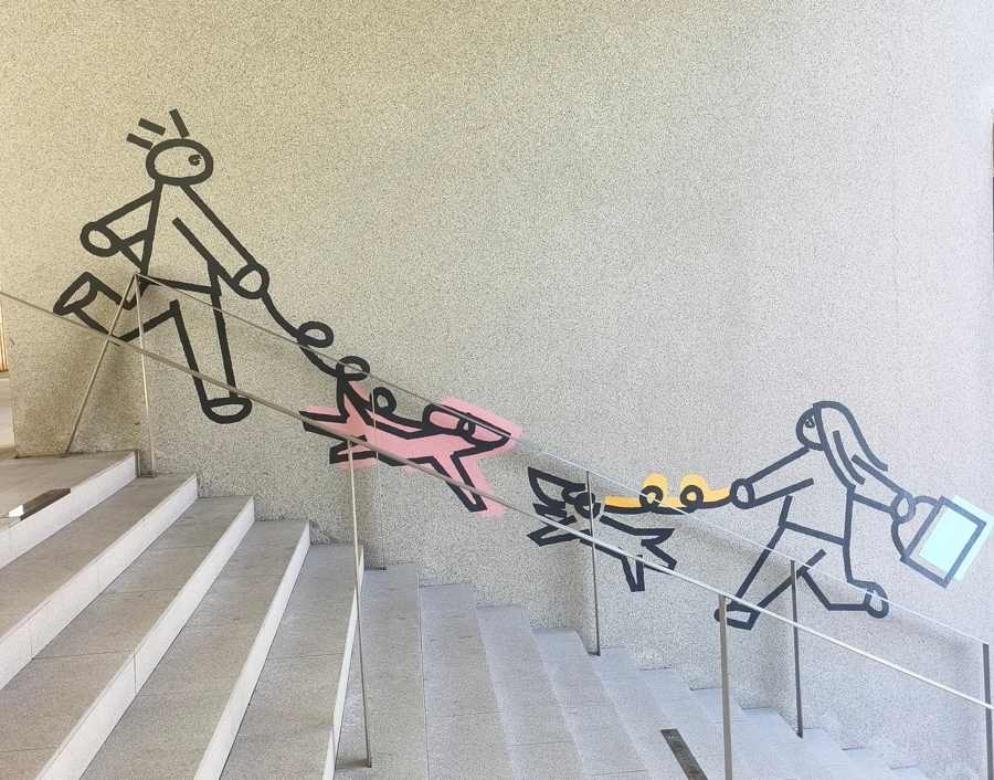 大大小小的墙面上,是人牵着狗、两两相遇的主题墙画;人宠主题的摄影作品,出现在商业区的楼梯拐角;张贴在社区入口处的《毛茸茸友好公约》,提示养宠人要使用牵引绳、居民不能随便投喂......