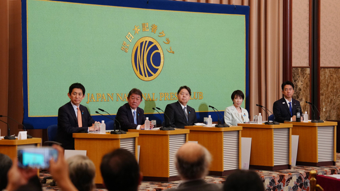 9月24日,在日本东京,日本自民党总裁选举候选人小林鹰之、茂木敏充、林芳正、高市早苗和小泉进次郎(从左至右)出席辩论会。