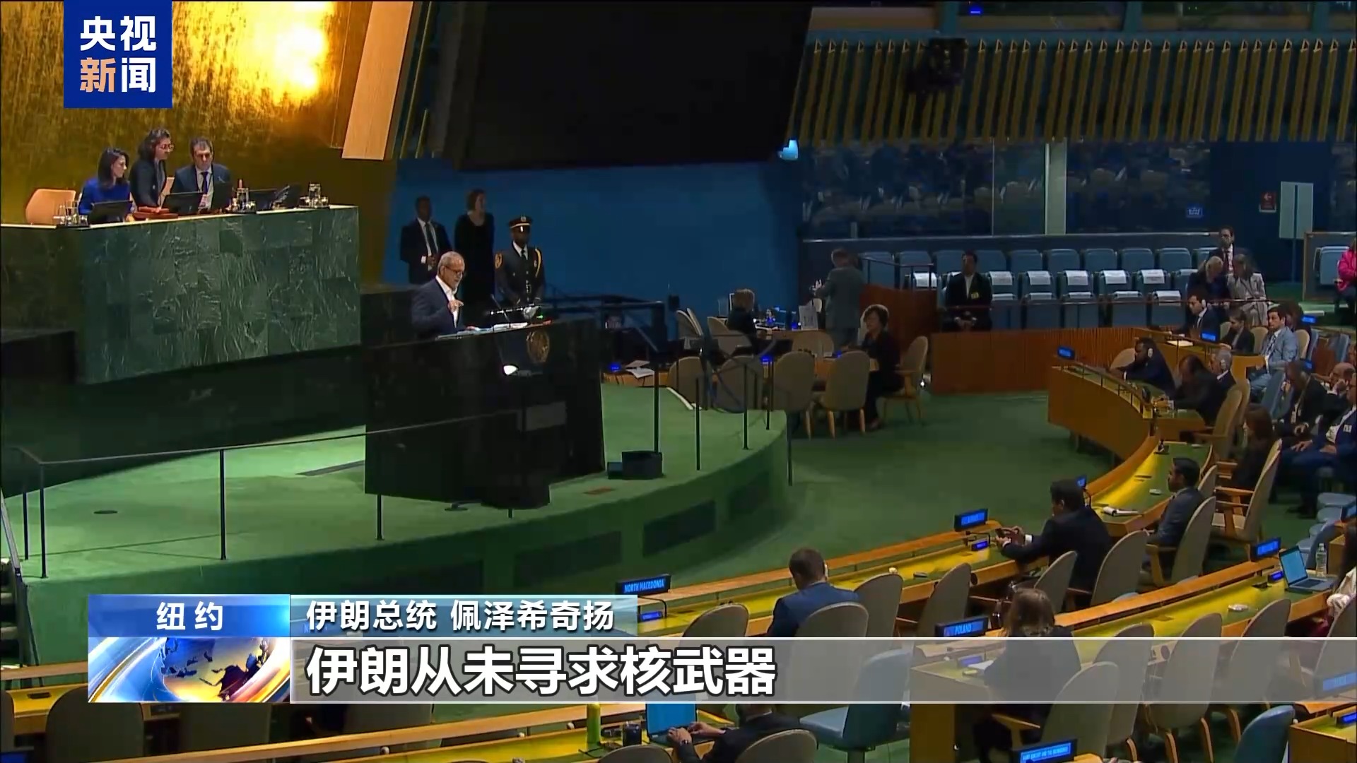 央视记者 徐德智:9月24日,联合国大会一般性辩论继续,乌克兰、巴拿马等多国领导人进行了发言。除了加沙等全球议题外,各方还就地区问题表达了立场。伊朗总统佩泽希奇扬重申,伊朗从未追求、也永远不会制造原子弹。