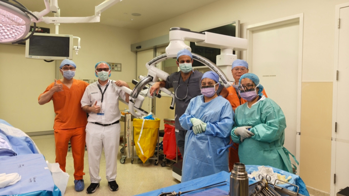克利夫兰诊所阿布扎比分院医护人员与图迈手术机器人合影。