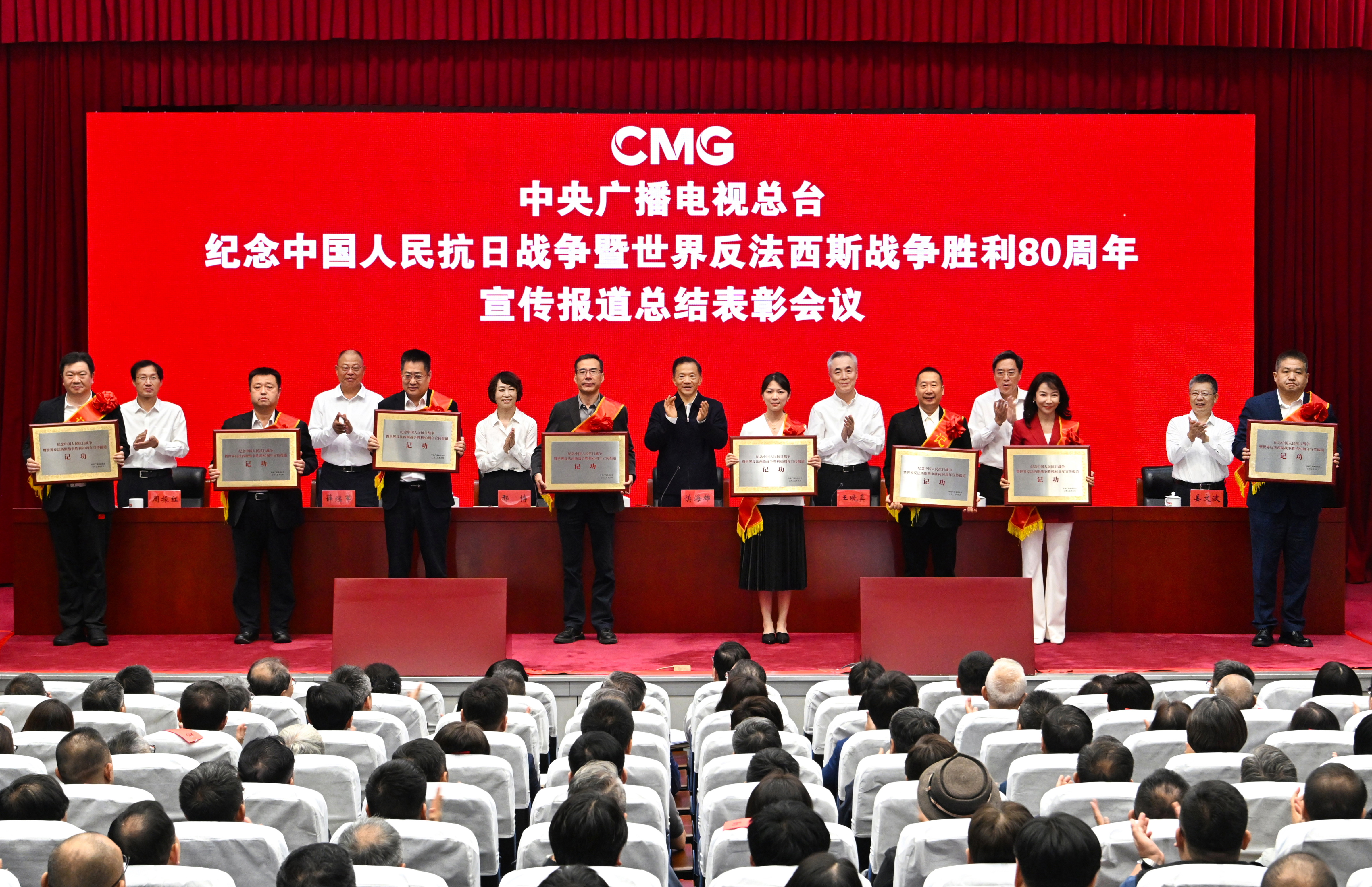 9月26日,中央广播电视总台召开纪念中国人民抗日战争暨世界反法西斯战争胜利80周年宣传报道总结表彰会议。中宣部副部长、中央广播电视总台党组书记、台长慎海雄出席会议并讲话。总台党组成员、副台长王晓真主持会议。总台党组成员、副台长邢博宣读表彰决定。总台党组成员、副总编辑范昀出席会议。