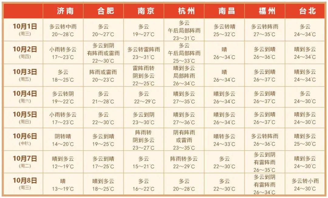 有出行计划的小伙伴注意了,国庆中秋假日期间华东地区多过程性天气,气温总体偏高。1日至4日华东北部地区降水频繁,局部地区雨量可达大雨到暴雨,伴有短时强降水和雷暴大风等强对流天气。5日至7日,华东中北部地区受冷空气影响自北向南有一次降水过程,局部地区降温幅度可达4℃至8℃。