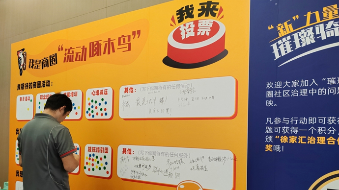 “取货停车走太远”“电梯慢”“快递没法寄放”“地铁口美食城环境很差”……昨天下午,在“璀璨徐家汇,骑迹暖商圈”徐汇区骑手友好商圈关爱活动上,骑手小哥们纷纷写下自己想反映的问题,街道相关人员表示,将收集这些问题并采取针对性措施,让骑手们的意见、建议成为街区治理的重要力量,让骑手也成为商圈的主人翁和议事人。