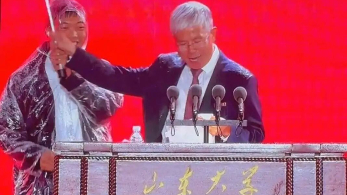 山东大学校长开学典礼在雨中演讲,两次婉拒师生送来的雨伞