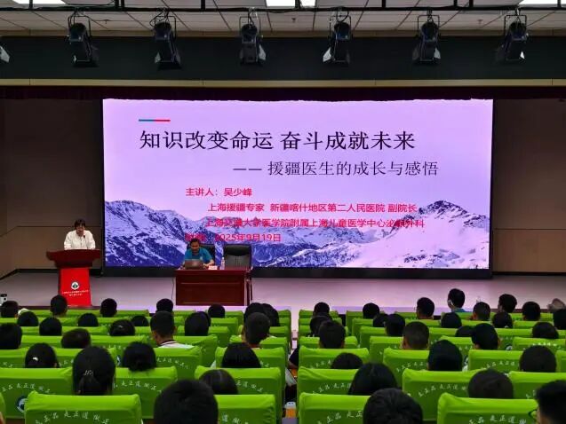 在中心会议室,吴少峰博士以《知识改变命运,奋斗成就未来》为题,分享了自己从安徽起步、赴上海深造、海外访学直至投身喀什医疗事业的成长历程。他通过真实的人生片段,生动阐释了“选择与努力并重”的深刻道理,鼓励学生树立远大目标,珍惜当下教育资源,用奋斗书写有意义的人生。