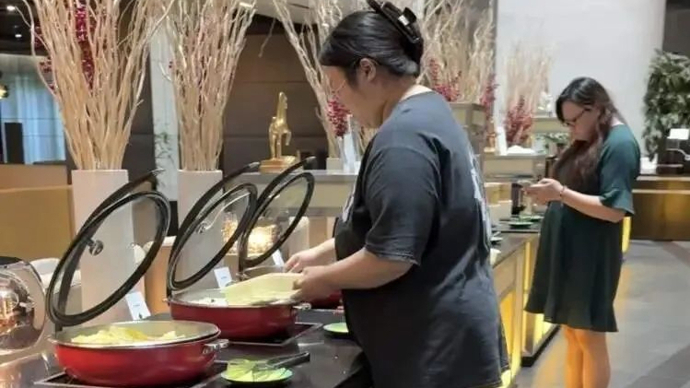 住在楼上的王女士也表示:“酒店最近搞这个盲盒很好的,菜可以自选,都让自己拿,服务态度也特别好。我喜欢吃冰西瓜、蔬菜色拉、牛肉,他们牛肉特别好吃,还有鸡块,都是营养的菜,在外面是买不到的,性价比很高,而且很方便,我也不要自己烧了。平时周一到周五大概有几十个人,都要排队的,不过来拿的客人还是比较有礼貌的,周边的商务楼的白领也会来吃,25元一份你在外面喝一杯咖啡也要这么多钱。”