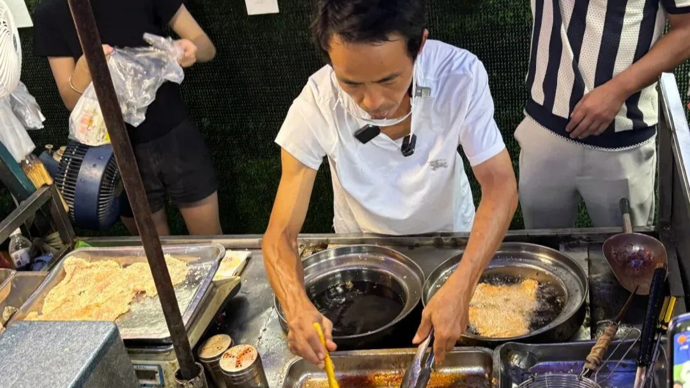 每天在他摊位前买鸡排的游客排满了整条街。