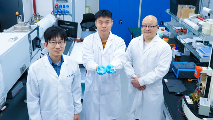 钱小石(左一)和学生一起展示高分子电卡薄膜,这也是登上《自然》的成果之一。