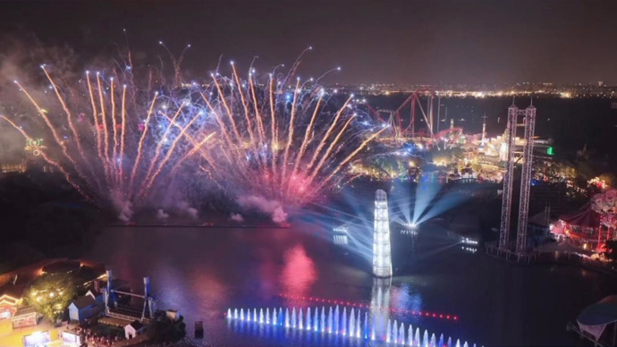 连续7晚,上海欢乐谷上演星河璀璨烟花盛典,七彩祥云烟花绽放夜空。千架无人机凌空亮相,巨型“国庆比心”等精彩活动接连上演。