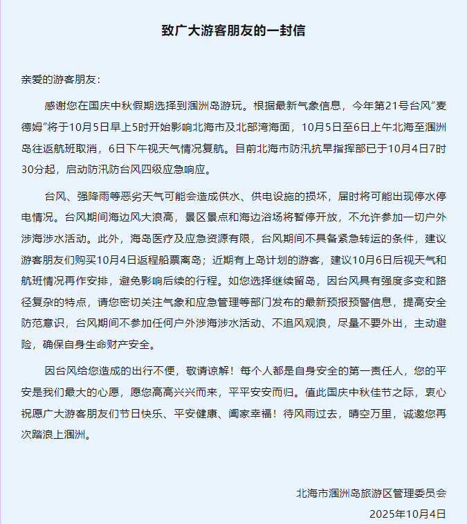 根据旅游区公告,10月4日航班不运送游客上岛,提前和加开离岛航班;10月5至6日北海至涠洲岛往返航班停航。涠洲岛景区及浴场于10月5日暂停开放,10月6日视天气情况动态调整开放情况。