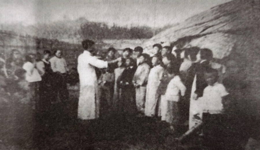 1937年,“孩子剧团”团员在难民收容所练歌。