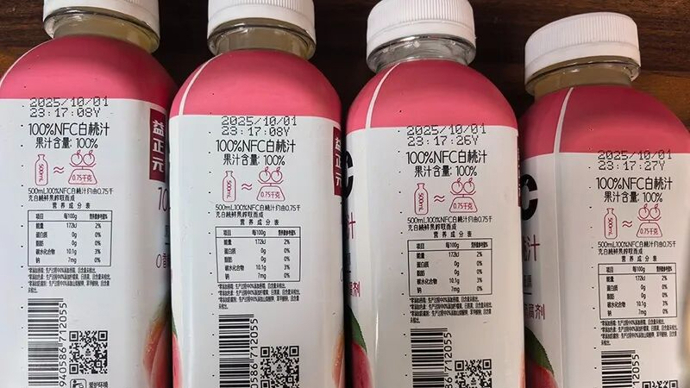 记者从王先生提供的照片中看到,该白桃汁饮料外包装显示生产厂家为山东养力多生物科技有限公司。四瓶饮料上的生产日期字迹清晰,均标注为“2025年10月1日23时17分”。