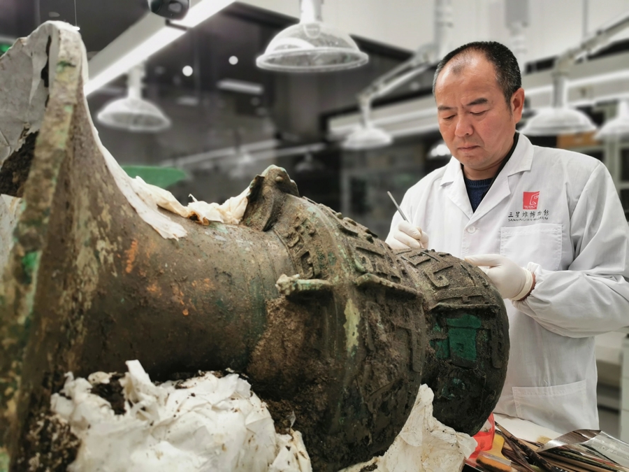 郭汉中在修复青铜尊。三星堆博物馆供图