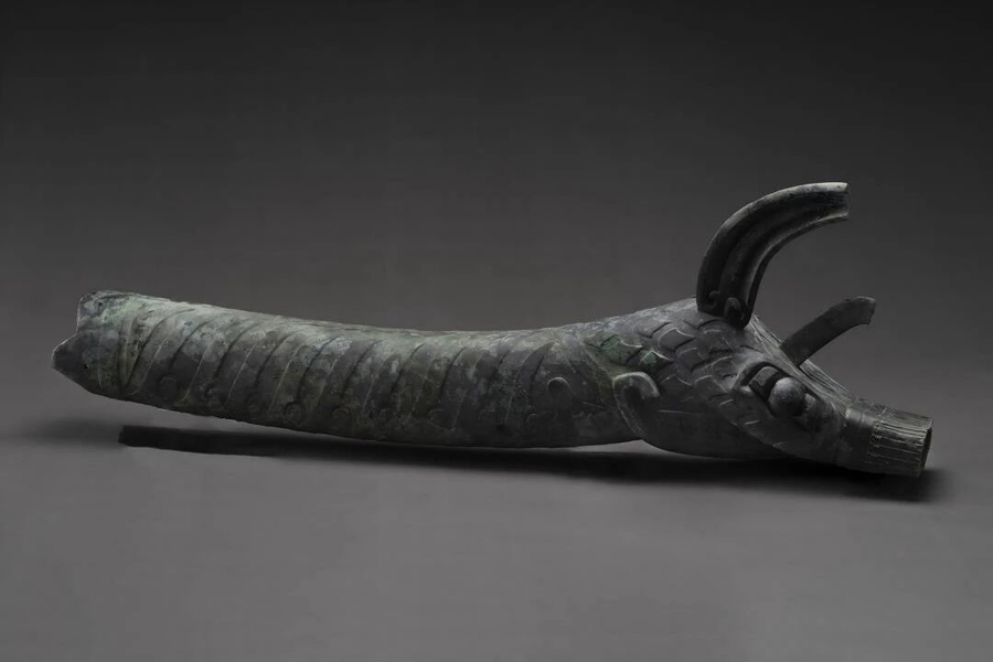 龙形象也在三星堆遗存中频繁出现,延续炎黄子孙共有的图腾,又添上古蜀独有的巧思。如青铜神树上或缘树而下、或昂首挺胸的神龙,鸟足神像青铜立人手中的龙首权杖,青铜大立人衣裳的龙纹样……