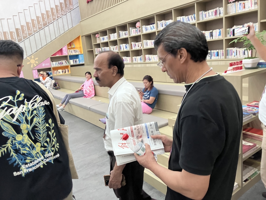 德里尼赫鲁大学中国与东南亚研究中心教授狄伯杰(B.R. Deepak)在开放式阅读空间驻足,发现书桌上的《解放日报》便拿起翻阅。他表示自己平时就爱看报,非常喜欢党建服务中心能有一个阅览室,给大家一个看报的空间。
