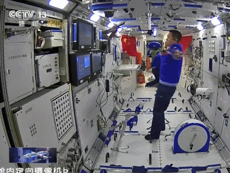 在汤洪波的提示下,聂海胜松开两只手在空中挥舞,这是上肢锻炼模式,为了增加航天员全身的锻炼效果。看来,这次大强度的运动并没有给聂海胜带来什么压力。