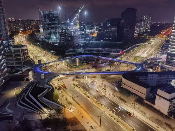 从高空俯瞰,一个不规则五边形连廊悬于空中,五边形的一条边与三门路平行走向,另外两条边分别与淞沪路和闸殷路垂直相交,银白色的金属桥体在夜晚灯光的渲染下,宛若一枚熠熠生辉的钻石。7月17日零点,新江湾城三门路空中连廊正式开通,与五角场“彩蛋”遥相呼应,成为上海杨浦的又一个新地标。