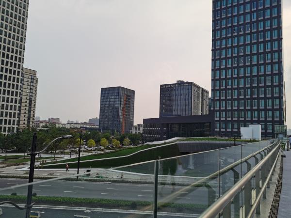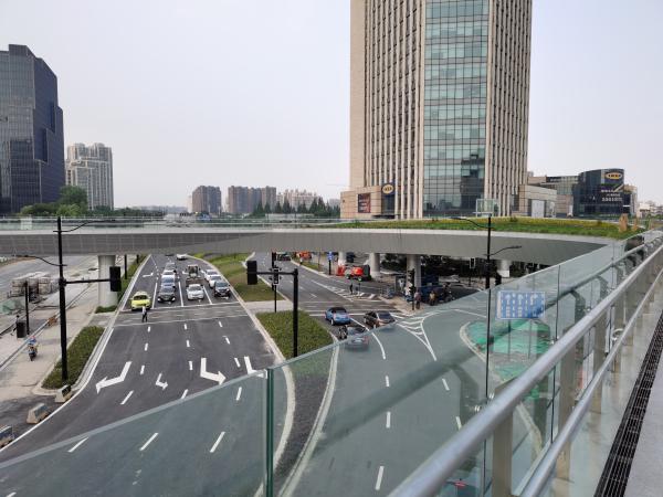 新江湾城空中连廊与传统过街天桥最大的不同,就在于它与周边空间的无缝衔接。钻石连廊的五个“触角”伸向五岔路口的各个街区,以步行楼梯、双向扶梯、垂直电梯、穿越绿化的曲径坡道、宽阔的阶梯景观平台等多种形式,同附近的办公楼、街区、绿化等高度融合在一起。