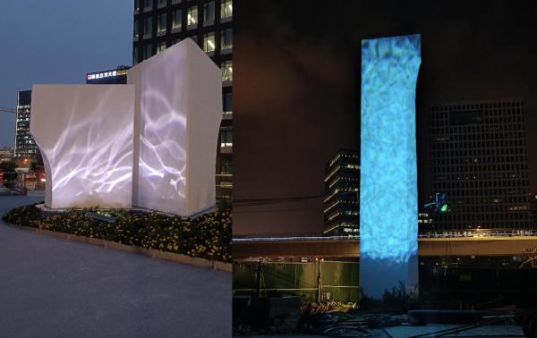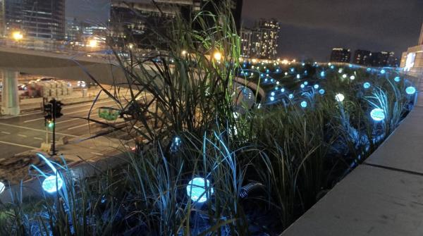另一个特殊构筑物位于桥体与2号口与创智坡道交汇处,它的功能也是排气孔,一半位于桥面下部,一半凸出于桥面上部。凸出桥面部分在其四周布置有景观绿植,灯具设备隐藏在绿植之中,动态的水纹灯具投射在构筑物的立面之上,形成了动态水波纹随波荡漾的景象。
