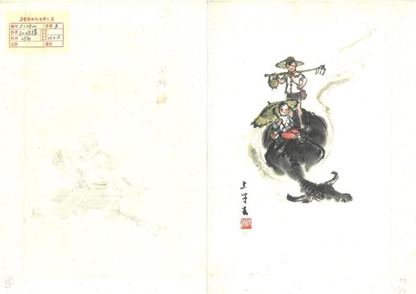 《上学去》描绘了背着书包的两个小童骑水牛去上学的情景。这是汪观清1961年为朵云轩木版水印《现代国画小品》系列创作的作品之一,也是“牛”在汪观清作品中第一次正式出现。