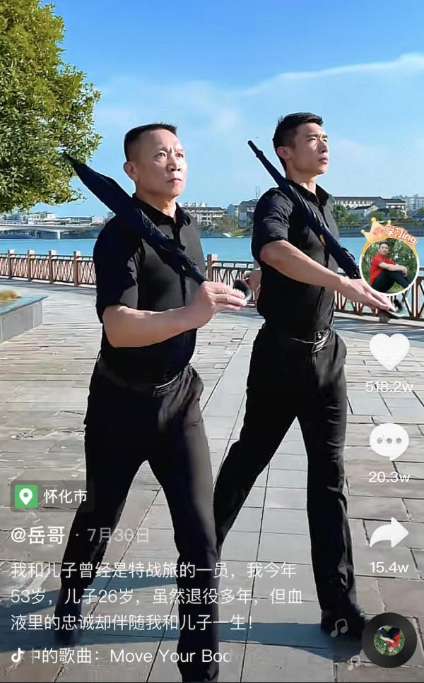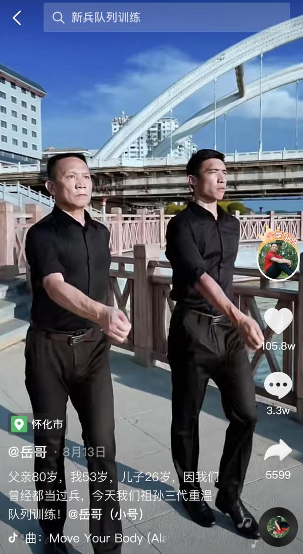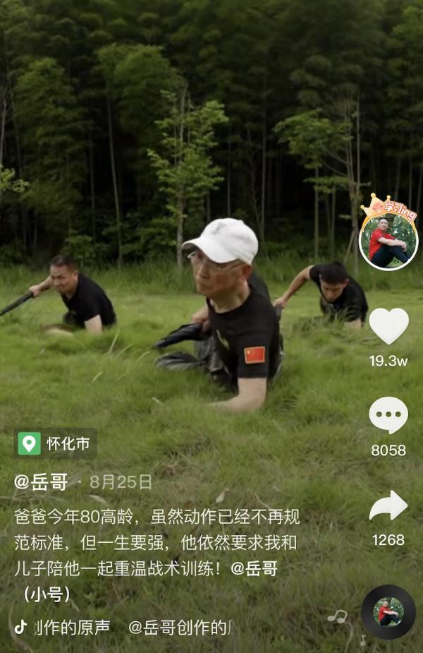 近日,主播“岳哥”在抖音上火了一把。在他的短视频中,“岳哥”跟80岁的老父亲和26岁的儿子,祖孙三代整齐划一地踢正步、敬军礼,进行战术训练……满满的正能量,在年轻人中引起极大的反响。“岳哥”表示想通过视频感染年轻人,提升阳刚之气,唤起青年参军入伍的梦想。