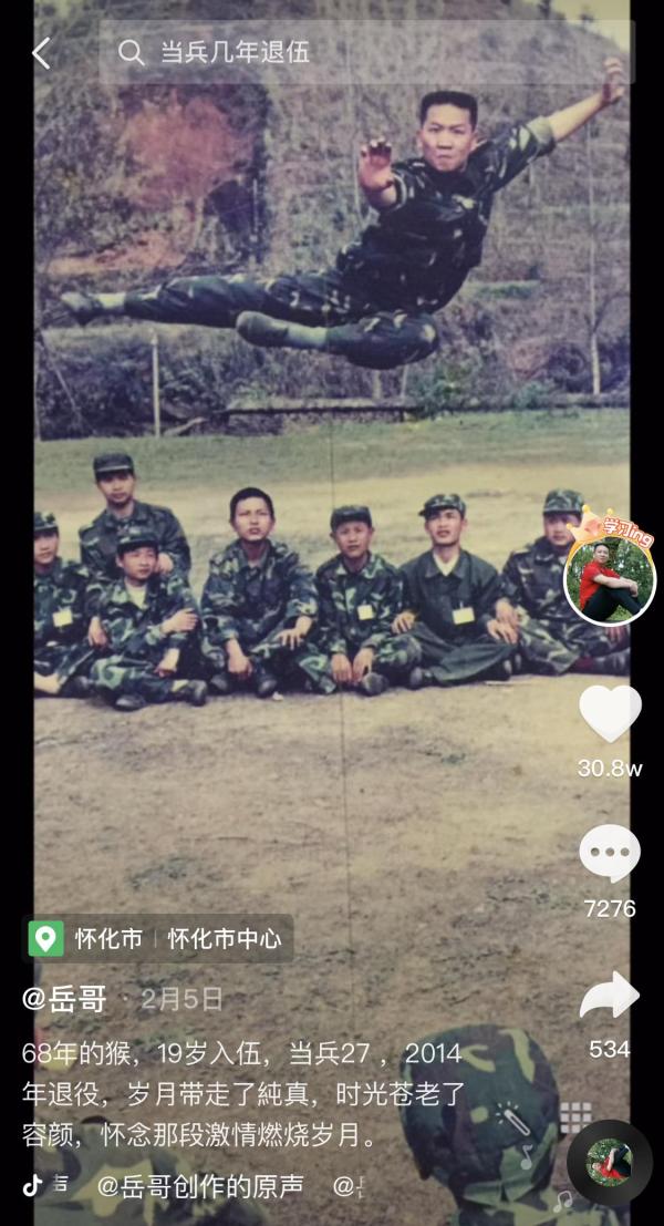 退役后的谌岳,在一次与友人的交谈中,得知短视频平台可以继续展现军人风采,激发了他想尝试一下的好奇心。“朋友说短视频平台可以展示自己的才艺,我下载了一看,里面有很多习武、退伍军人的视频。我自己也是一名老兵,于是开始尝试拍摄。”