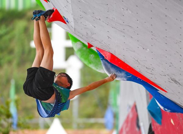 上午举行的攀石难度赛,考验着选手的脑力和体力。面对岩壁上的岩点,如同一道待解的数学题,需要正确解读,并规划最合理快速的路线,最后手脚并用真正去实现。
