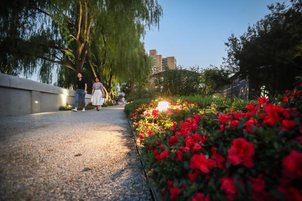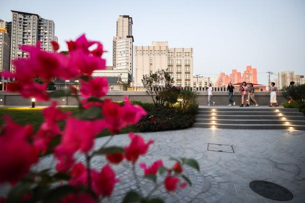 原本分隔校园与河滨步道的围栏全部被拆除,缓坡草坪、精致花境、匠心点景,由慢行步道串联的滨水空间变身多元、活力、共享的“后花园”。