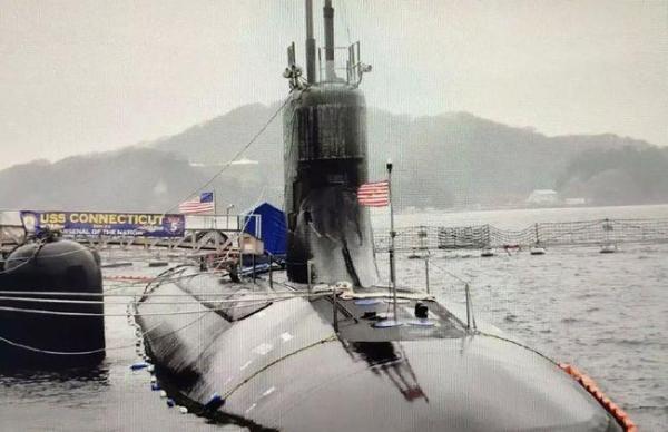 照片上这艘停泊在港口的潜艇,“康涅狄格”号的舰名(USS CONNECTICUT)没错,潜艇指挥台围壳前部的弧形填角有着明显的撞击痕迹。因此很多人都将它当成了“康涅狄格”号这次返回关岛后的真实受损照片,还认真根据撞击位置分析可能是由什么东西导致的事故。