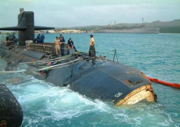 照片上的这艘,就是最近一提到海底撞山就要被拿出来鞭尸的美国“旧金山”号核潜艇。它于2005年在太平洋海域高速撞上海底山脉,造成艇上一名水手身亡、超过20人受伤,这段记录堪称美国海军核潜艇的黑历史。