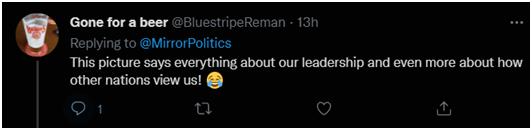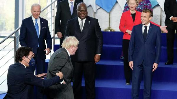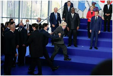 据英国《镜报》等媒体报道, 当天在拍摄领导人合影环节时,其他领导人已在合影台上站定,约翰逊和特鲁多才匆匆赶来。意大利总理马里奥·德拉吉大喊约翰逊的名字,而其他一些等候多时的领导人则对迟到的两人发出“幽默的责备声”。