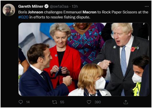 有网友则对约翰逊和马克龙二人碰拳的照片有另一番解读,他讽刺:从照片来看,这是二人在G20上用“剪刀石头布”来努力解决两国的渔业争端问题。↓