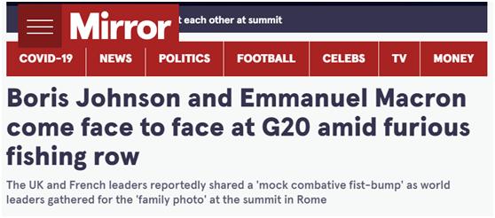 “愤怒的渔业纠纷期间,约翰逊和马克龙在G20会面。”英国《镜报》30日以此为题报道,并分享了二人此次面对面会晤的一个插曲。报道称,30日峰会开幕当天,到达现场的各国领导人们正打算拍一张“全家福”照,有媒体注意到,英法两国领导人约翰逊和马克龙,“假装对抗式”地碰了下拳头。↓
