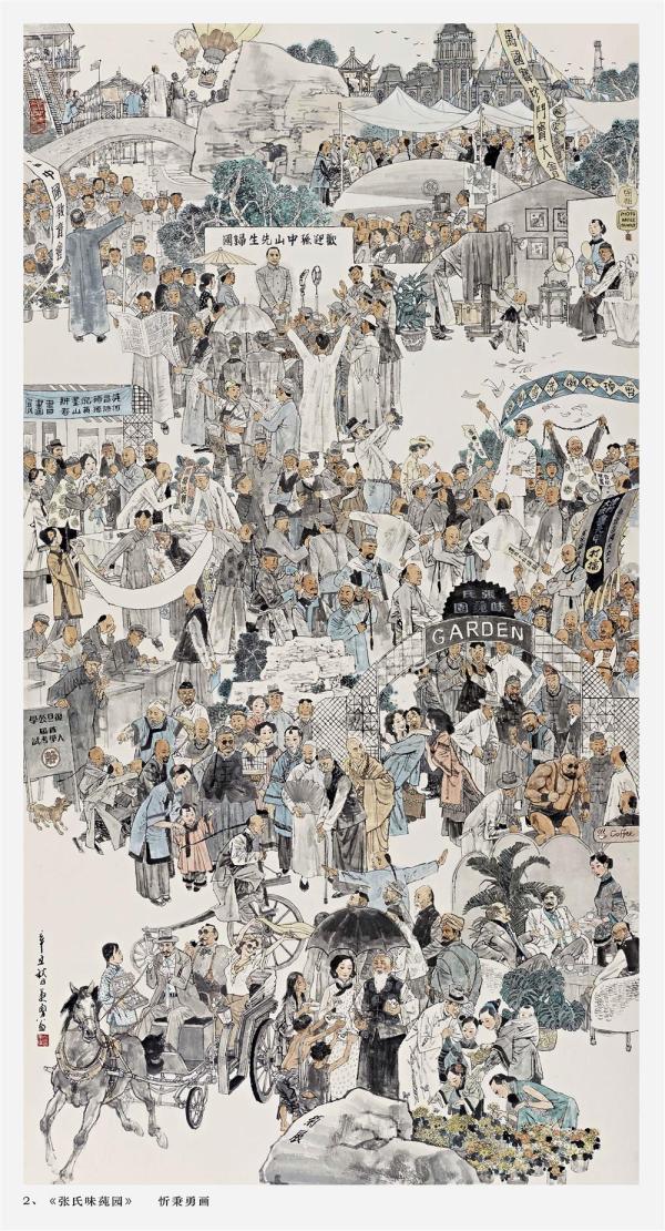展览中特别引人瞩目的是一套《上海百年纪事》作品,整个画展以此为题。《上海百年纪事》选取老上海典型地点,并以该地点发生的故事为主题,画面中,既有市民百态,也不乏大量的历史人物和重要历史事件。该套作品由《洋泾浜》《九曲桥》 《张氏味莼园》《十六铺》《四马路》《爱俪园》《百乐门》《大世界》《上海解放》等构成。